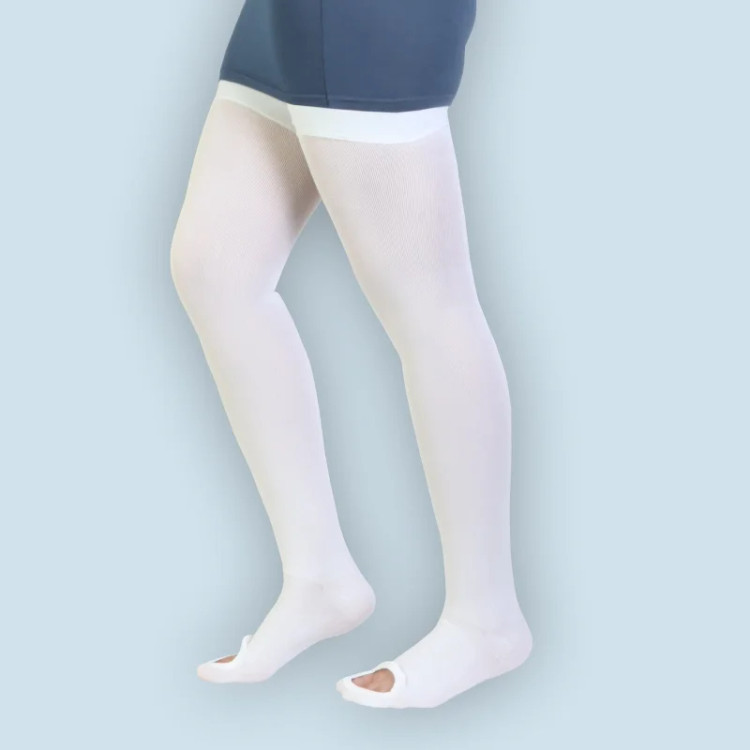 جوراب ضد آمبولی، باید فشار متوسطی بین 15 تا 20 میلیمتر جیوه تامین کند. این جوراب از پارچهی الاستیک و باکیفیت بالا تولید شده و فشار لازم و کافی را به مناطق تحت پوشش خود اعمال می نماید.