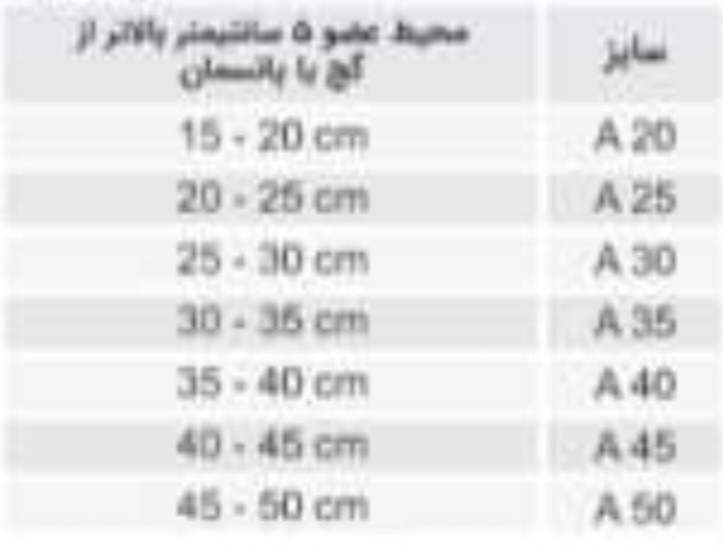 محیط عضو آسیب دیده را از 5 سانتیمتر بالاتر از جایی که از گچ یا پانسمان پوشیده شده با متر پارچهای اندازهگیری کرده، سپس بر اساس جدول ضمیمه سایز مناسب را انتخاب نمایید.