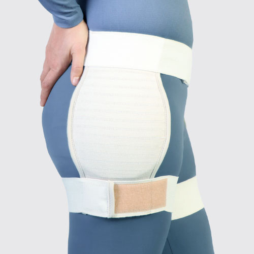 · کشها را با استفاده از چسبکهای پشت و جلو به دور کمر خود بگونهای ببندید که پدهای لگنی بصورت متقارن در دو طرف لگن قرار بگیرند و برجستگیهای مفصل ران را کاملاً پوشش دهند