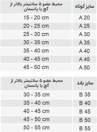 محیط عضو آسیب دیده را از 5 سانتیمتر بالاتر از جایی که از گچ یا پانسمان پوشیده شده با متر پارچهای اندازهگیری کرده، سپس بر اساس جدول ضمیمه سایز مناسب را انتخاب نمایید.